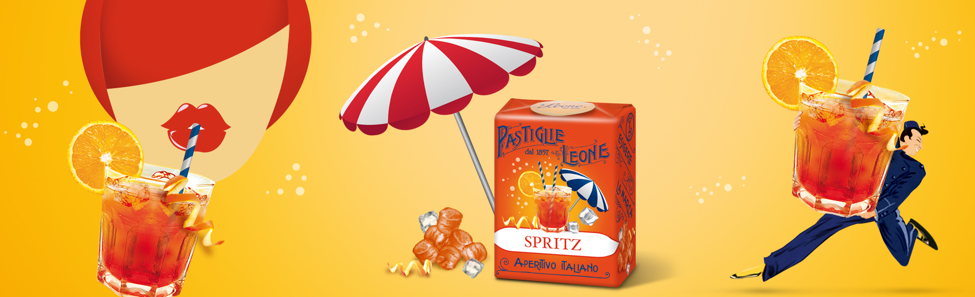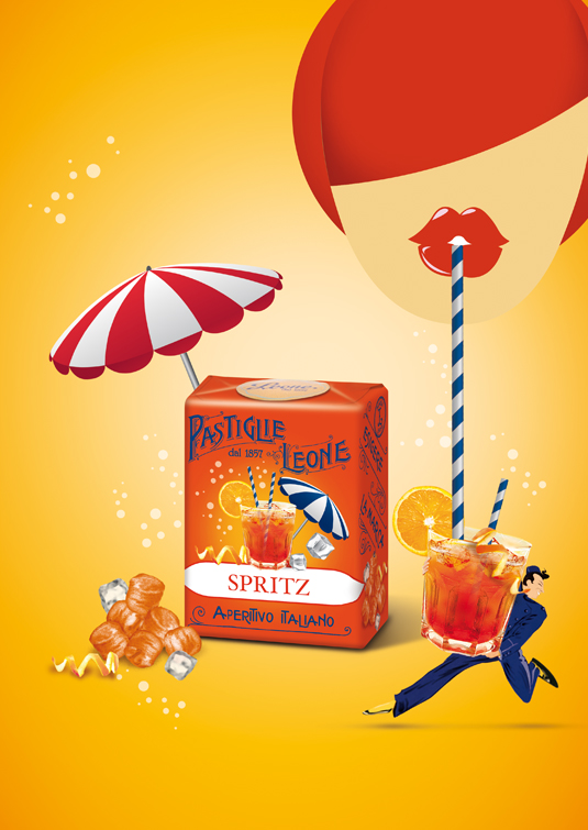 Un bicchiere con cannucce che ricordano i pali di ormeggio veneziani, un ambiente balneare anni ’60, un concierge di albergo e un’avvenente signorina. L’obiettivo: far venire voglia di bere 60g di Pastiglie Spritz!
